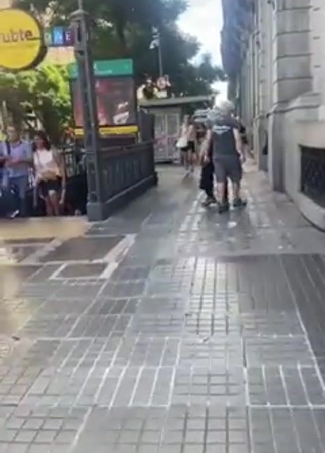The video captures a sidewalk scene on a bright day, focusing on pedestrians walking along the street. The camera follows a couple walking away from the subway entrance. The sidewalk is a patchwork of stone tiles, with some sections featuring textured patterns. Buildings loom on the right. The subway station is on the left, marked by a sign with "Subte D" and an entrance. The atmosphere seems urban and populated.