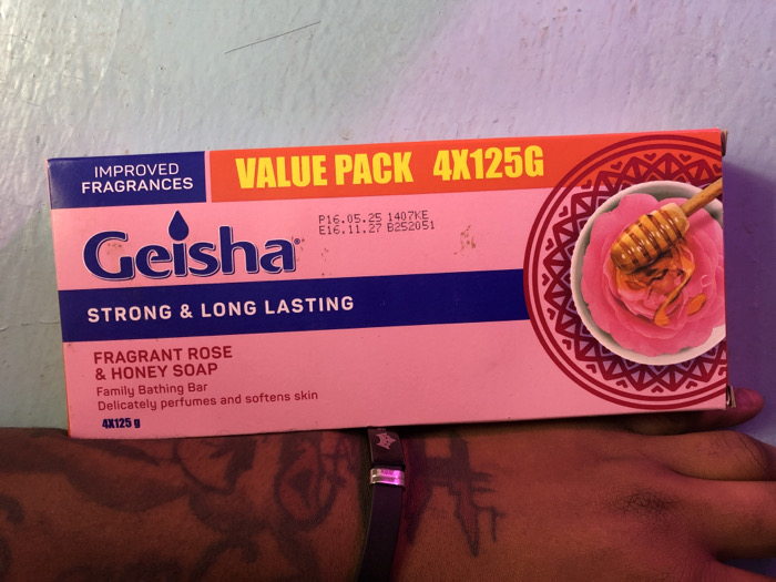 - "The image displays a "Geisha" brand "Fragrant Rose & Honey Soap" value pack, held by a person in Nyeri, Kenya" by FM-E8bxZ2, licensed under CC BY 4.0