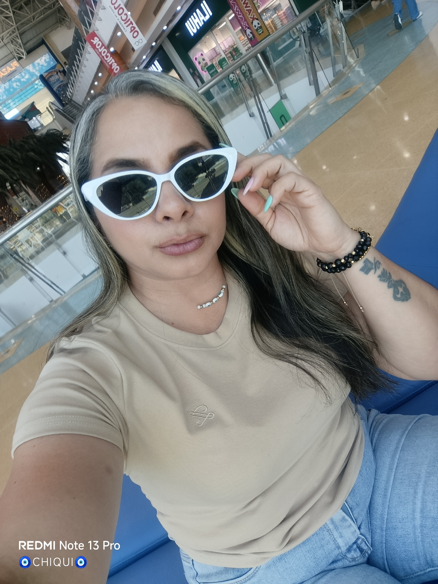 woman wearing white sunglasses, a beige t-shirt, a beaded necklace, and a black bracelet with gold accents. She has a tattoo on her left forearm. She is wearing light blue jeans and sitting on a blue surface. The background shows an indoor shopping mall in Porlamar, Venezuela. The signage for shops like "Opticolor" and "Iuhaji" is visible. There are multiple levels of the mall, with glass railings and people visible on different levels. The lighting is bright and the mall appears modern.
