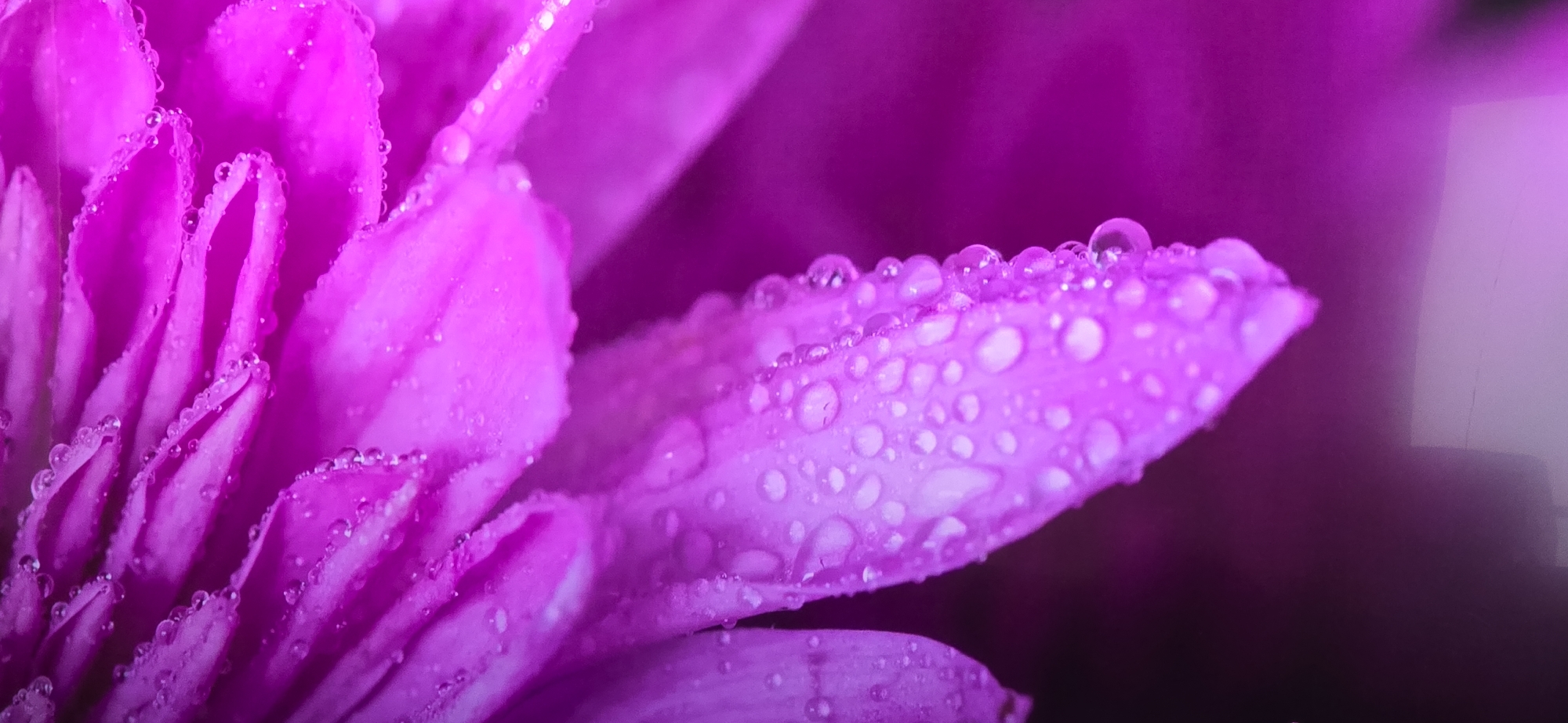 A close-up photograph showcases the vibrant purple petals of a flower, possibly a chrysanthemum or a similar bloom with layered petals