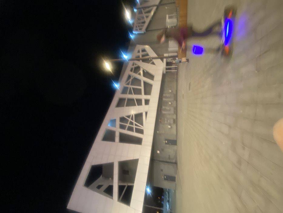 The image depicts an outdoor night scene in Yekaterinburg, Russia, specifically in the vicinity of the Central Stadium (Yekaterinburg Arena). The dominant feature is a large, modern architectural structure on the left and center, characterized by a white, angular facade with multiple geometric openings and patterns, appearing as external cladding or elevated walkways of a building. The lower portion of this structure has a darker, possibly concrete base with several dark, rectangular doors and mounted utility panels. The ground surface is a paved area, likely composed of light-colored tiles or concrete. Overhead, the dark night sky is illuminated by several artificial light sources, including streetlights emitting a warm yellow-orange glow, with noticeable blue lens flares around them. In the mid-ground, to the right, a person is captured in motion, appearing blurred. This individual is dressed in dark attire and is operating a personal mobility device, possibly an electric scooter, which features prominent blue LED illumination on its base and a bright blue light on its vertical shaft. The person's movement is generally from left to right across the frame. Further in the background, closer to the base of the building, a second, smaller figure is discernible, appearing stationary.