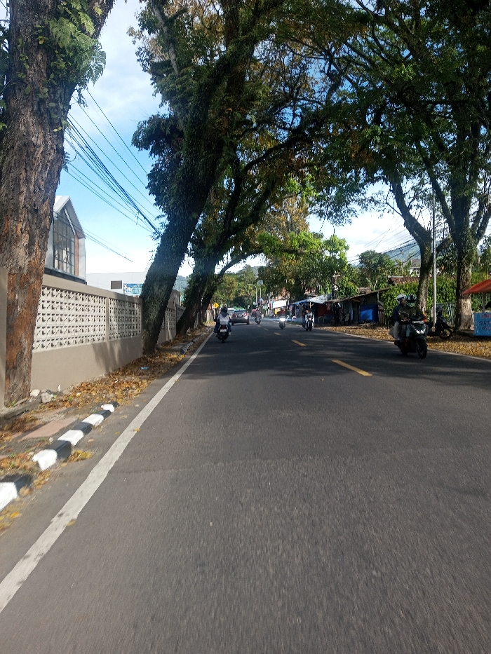 The image displays a daytime street scene in Phonengam, Laos, from a low-angle perspective looking down a paved asphalt road. The sky is clear blue overhead. Large, mature trees with dense green foliage and rough trunks line both sides of the road, creating a partial canopy. On the immediate left, a black and white striped curb borders the road, followed by a narrow dirt strip strewn with dry, fallen leaves. Beyond this, a light-colored concrete wall, featuring a repetitive pattern of open rectangular blocks, extends into the background. Behind the wall, a modern building with a prominent A-frame or sharply pitched roof section and large windows is visible. Multiple black utility wires run above the wall and trees. The road surface is dark asphalt with a continuous white line marking its left edge and a broken yellow line indicating the center. Numerous motorcycles (scooters) are present on the road. In the foreground on the right, a dark-colored scooter is moving towards the viewer, ridden by an individual wearing a helmet. Several other scooters are observed further down the road, some traveling in the same direction, others appearing to head in the opposite direction. Two light-colored cars are visible in the distance, moving away from the viewer. On the right side of the road, beyond the line of trees, a series of simple, roadside structures or stalls with varied roofing materials are visible. Shadows from the trees are cast across sections of the road.