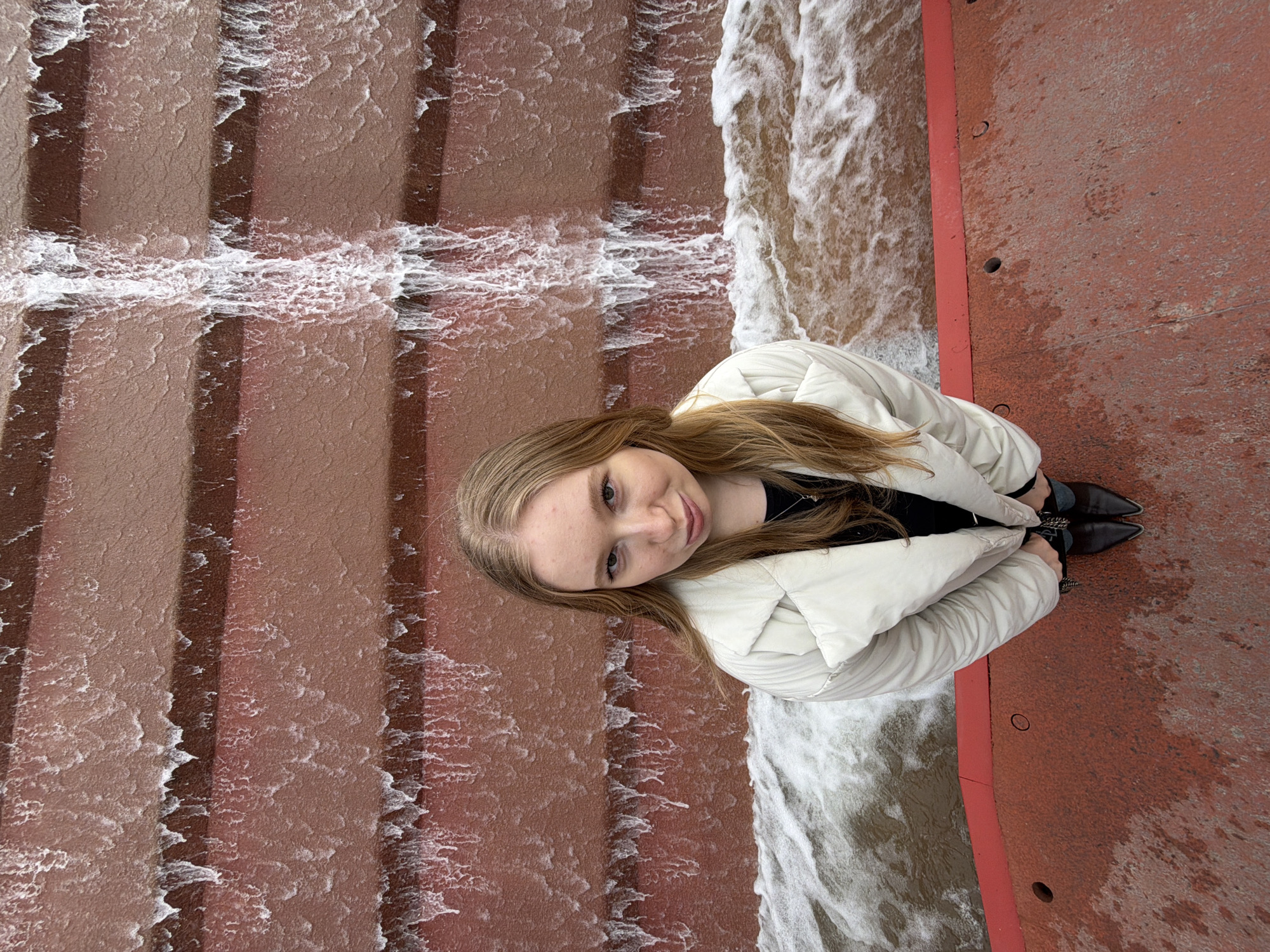 A young woman with light brown hair and a white jacket is standing on a red surface near a cascading body of water