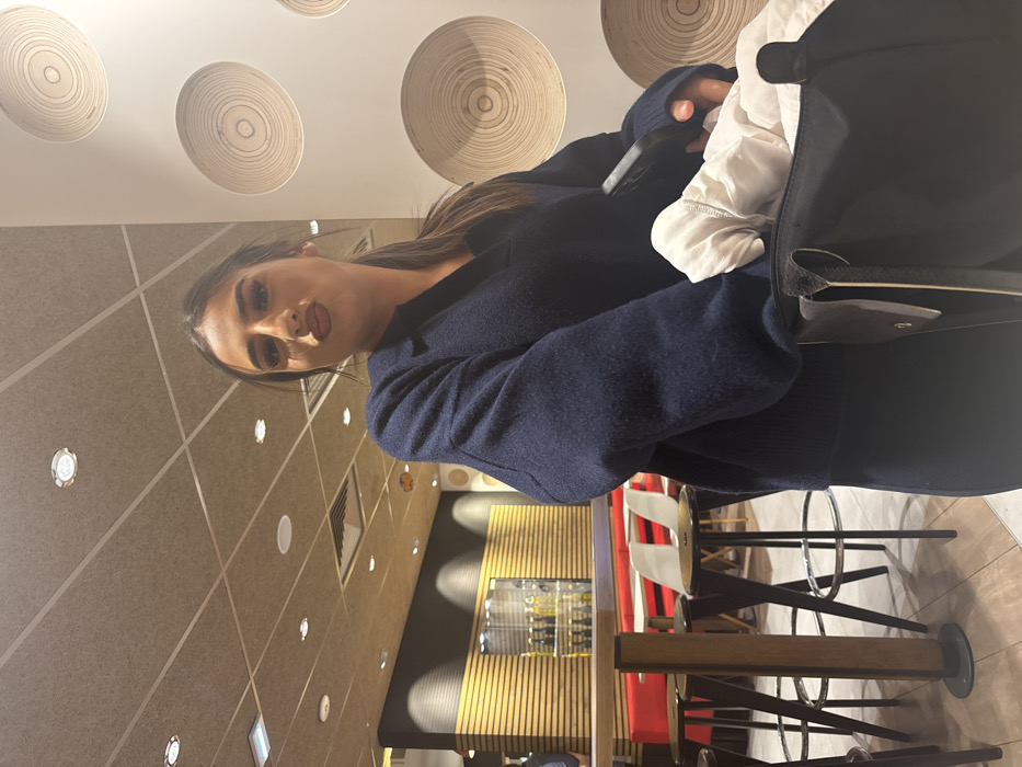 The image depicts a female subject posing in an indoor commercial dining establishment located in Erstein, France. The subject, positioned centrally, is a female with dark hair pulled back into a ponytail and wearing dark lipstick, captured with a pouting expression while looking directly at the camera. She is dressed in a navy blue long-sleeved collared sweater and dark pants. Her left hand holds a dark-colored smartphone. Her right arm is positioned near a black bag, inside which a white, crumpled garment or object is partially visible. The background shows a contemporary dining interior. To the subject's left, a counter area with tall black bar stools is visible. Behind this, a wall features horizontal light-colored wooden slats, with a darker section above. A glass partition reveals a shelf displaying multiple bottles, possibly containing olive oil or similar condiments. Further back, red booth seating is arranged with white chairs opposite. To the subject's right, a white wall is decorated with several large, circular elements displaying concentric ring patterns, resembling natural wood or woven materials, arranged vertically. The ceiling is an acoustic tile grid with numerous recessed circular light fixtures. The flooring appears to be a light-colored tile or wood.
