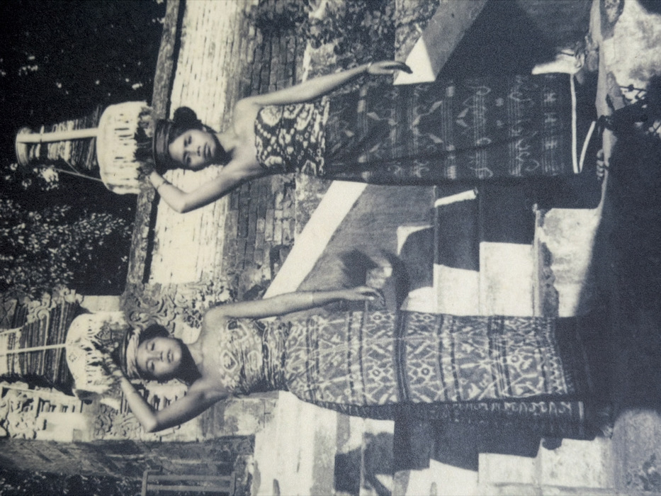 Two Balinese women in traditional clothing are shown in a black and white photograph