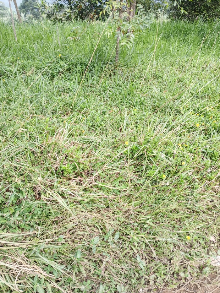 This image displays an overgrown vegetated area in Thotagamuwa, Sri Lanka. The scene is dominated by a dense, unkempt covering of predominantly green and partially dried, yellowish-brown grasses and various ground cover plants. Several small yellow flowers are scattered throughout the foreground and midground vegetation. In the background, taller trees with green foliage and visible trunks indicate the presence of a treeline or forest edge. No individuals, animals, or artificial structures are observed. The environment appears natural and undisturbed, under ambient daylight conditions.