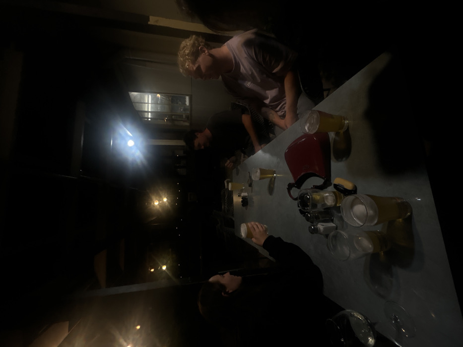 four individuals seated around a rectangular table in a dimly lit outdoor or semi-outdoor patio area at night in Thirroul, Australia. On the left side of the table, a person with dark hair, wearing a dark top, holds a full pint glass of beer. Their face is visible in profile, looking towards the right. To the far left, a wine glass rests on the table. Towards the back of the table, a male with short, dark hair, wearing a dark t-shirt, is seated and visible from the chest up, looking generally to the right. To his right, a male with blonde, curly hair, wearing a light-colored t-shirt, is seated and visible from the waist up, looking towards the far right. A fourth person's dark head and shoulder are barely visible on the extreme right edge of the frame. The light-colored table holds several pint glasses, many containing beer, alongside salt and pepper shakers, a red handbag, and a small yellow object. Overhead string lights are visible in the background, creating multiple lens flares. A bright, undefined light source on the far right also causes a prominent flare. The overall environment is dark, suggesting a nocturnal setting.