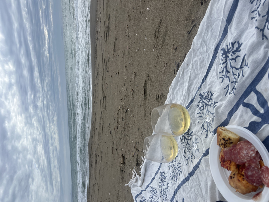 A forensic examination of the image reveals a beach scene in Castiglione della Pescaia, Italy. In the immediate foreground, a white and blue striped blanket with a coral-like pattern is spread on the sand. On the blanket, two clear stemmed wine glasses contain a pale yellow liquid consistent with white wine. To the lower left, a white disposable paper plate holds an assortment of appetizers, including sliced salami, pieces of focaccia-style bread, and other dough-based items, some with visible red sauce. The midground consists of dark, wet sand with faint footprints and scattered small debris, leading towards the water. The background features a turquoise ocean with white-capped waves breaking near the shore. A faint coastline is visible on the distant horizon, and the sky above is largely covered with overcast, stratified clouds. No individuals are present in the frame.