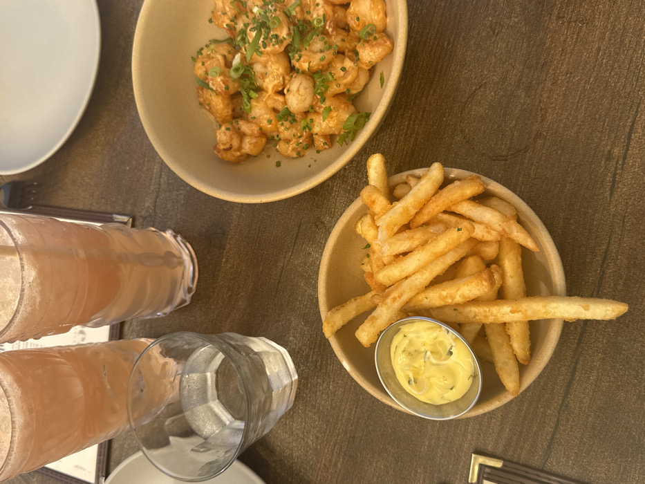 This image depicts a dining scene in Los Angeles, United States, viewed from a slightly elevated, close-up perspective. The primary subjects are food and beverages arranged on a dark wooden table. Two tall, textured clear glasses containing a frothy pink beverage are positioned in the upper left, one with a straw. A clear glass filled with water is situated directly below the left pink beverage. To the lower left, a light-colored bowl holds a portion of golden-brown French fries, alongside a small metallic ramekin containing a yellow dipping sauce garnished with green herbs. To the right, another light-colored bowl contains numerous cooked shrimp or prawns coated in a creamy, reddish-orange sauce, topped with chopped green chives. A portion of a white plate is visible in the upper right quadrant, and a menu or booklet is partially visible beneath the pink beverages. No individuals are present in the frame.