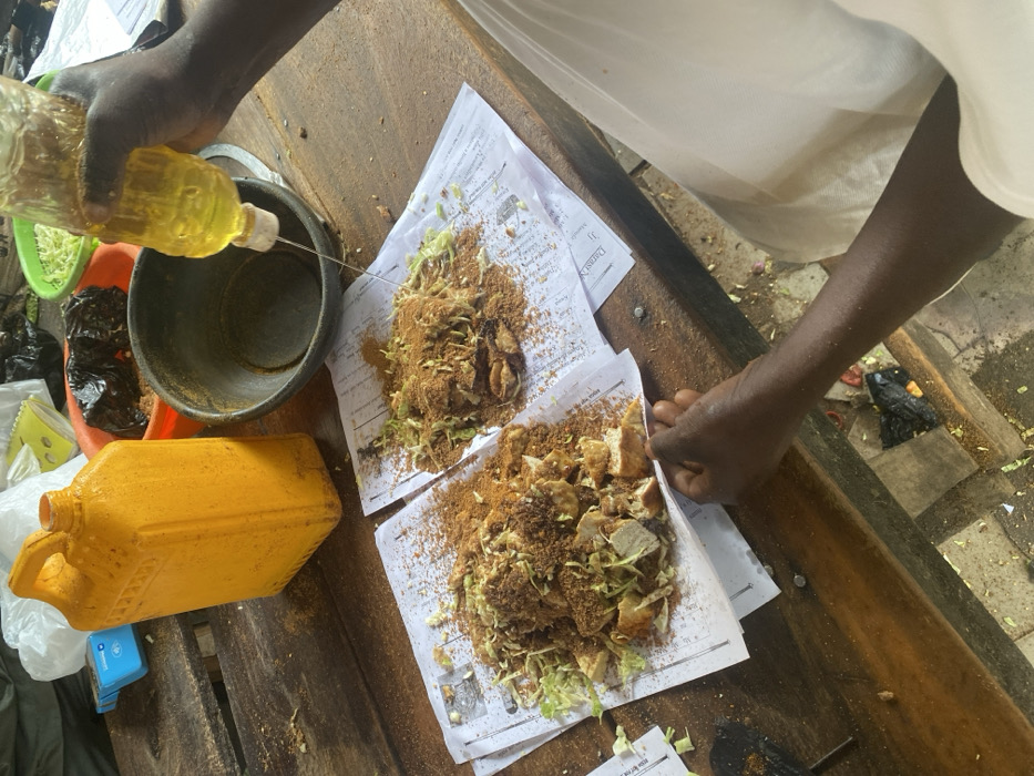 A person prepares a meal on a wooden surface. The ingredients include fried tofu, shredded lettuce, and a brown powder, served on pieces of paper. The person pours oil from a plastic bottle into a pot, presumably for cooking or dressing the meal. A yellow plastic container sits nearby, along with other cooking items. The scene suggests street food preparation.
