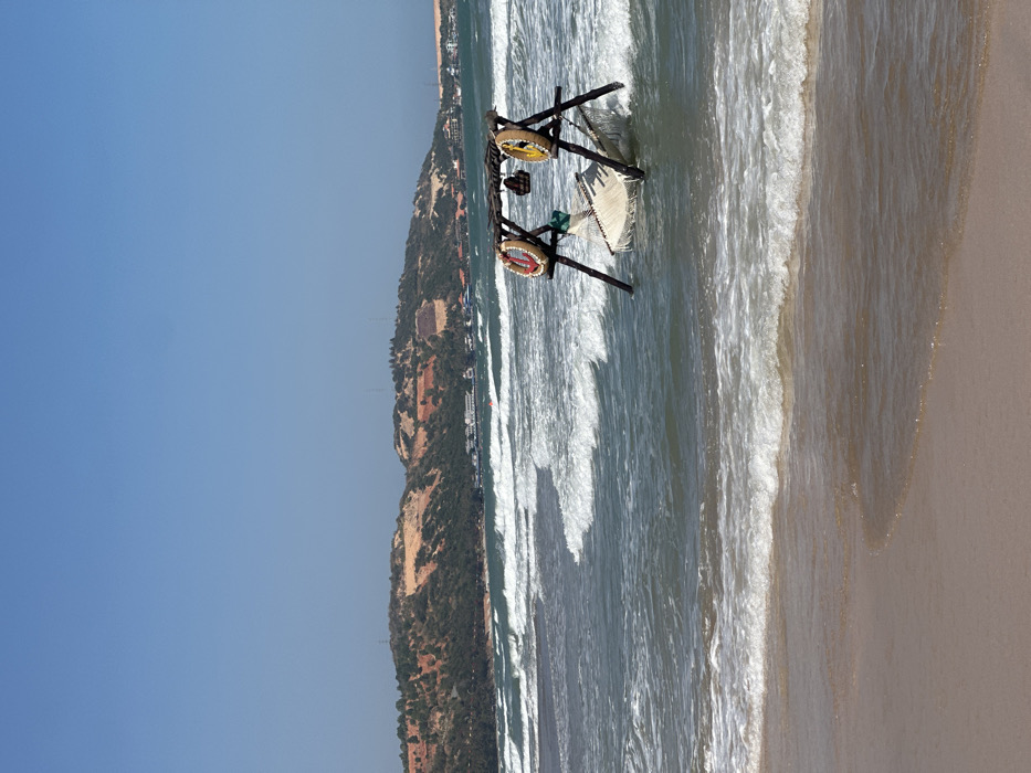 A sunny beach scene features gentle waves washing onto a sandy shore. A decorative wooden structure with circular accents stands partially submerged in the water. Inland, a forested hill ascends under a clear blue sky. The image is oriented vertically, emphasizing the shoreline and the gradient from sea to land.