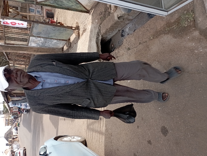 An elderly Black male subject is observed walking on a paved street in Jos, Nigeria, under bright daylight conditions