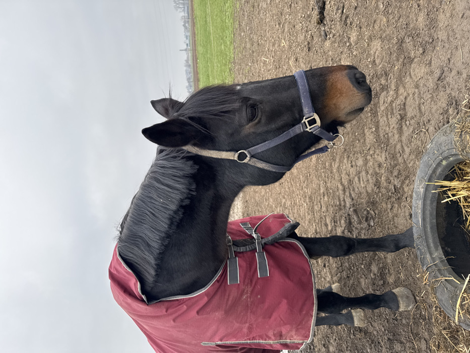 - "The scene depicts a dark bay or black horse standing in a muddy outdoor enclosure in Estaimpuis, Belgium" by FM-xTDQG2, licensed under CC BY 4.0