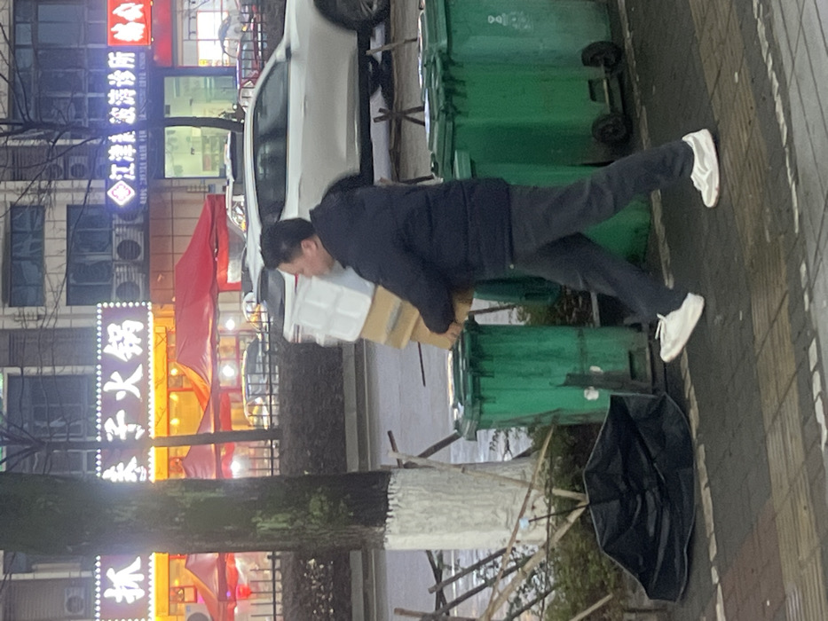 A male individual is depicted walking left-to-right on a wet paved sidewalk in Shuangfu, Jiangjin District, Chongqing, China. He carries a stack of three items: two white rectangular containers atop a brown cardboard box. The individual wears a dark blue puffer jacket, dark trousers, and white athletic shoes. To his immediate left, a tree with a white-painted base stands next to a black, collapsed object resembling an umbrella or bag on the ground. Two green, wheeled public trash cans are positioned behind him. In the background, across a wet asphalt road, commercial buildings feature illuminated Chinese signs, including "秦子火锅" (Qinzi Hotpot) and "江津区 玻涛诊所" (Jiangjin District Botao Clinic). Red outdoor tents are visible beneath the "Qinzi Hotpot" sign. Parked and moving vehicles, including a white SUV, are present on the road. The scene is illuminated by artificial lights, indicating evening or night conditions.