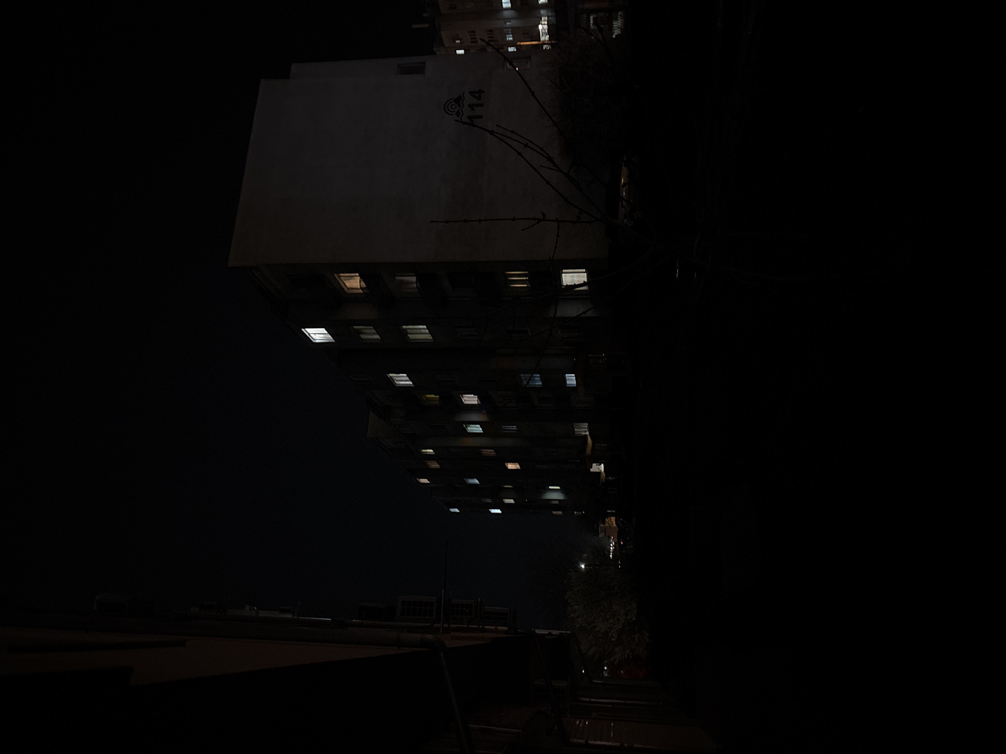 The image depicts a dimly lit, nighttime view of a building in Burgas, Bulgaria. The building's facade, visible from a low angle, features numerous illuminated windows suggesting occupancy. The number "114" is displayed prominently on the upper section of the building. A bare tree branch extends from the right side of the frame, partially obscuring the building. The foreground features a dark, indistinct area possibly representing a street or surrounding terrain. The overall ambiance is dark and urban, with a focus on the building's illuminated windows against the night sky.