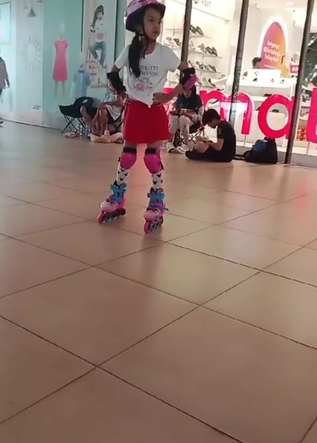 A young girl in a pink helmet, pink and blue roller skates, a white shirt, and a red skirt stands stationary in a large indoor space with tiled floors, possibly a shopping mall, with her hands on her hips