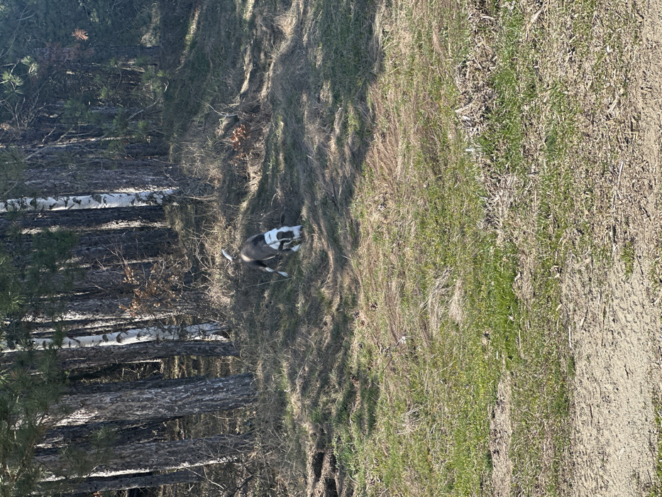 The scene is situated at the edge of a forest within the city of Bahalin, Bulgaria. A medium-sized dog, primarily dark brown/grey with white markings on its face, chest, and legs, is positioned on a grassy slope in the midground. The dog's head is lowered to the ground, indicating sniffing or foraging. Its tail is dark with a white tip. The background features a dense tree line consisting of both coniferous pines and deciduous birches with distinctive white bark. The ground cover on the slope comprises a mix of green and dry, brown grass, with visible patches of bare earth. The foreground presents a lighter-colored dirt path or cleared area. The environment is under direct, bright sunlight.