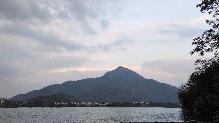 The image displays a wide-angle landscape view of Arunachala Hill in Tiruvannamalai, India, captured from across a body of water, likely a lake or large pond. In the foreground, the calm water surface occupies the lower half of the frame, exhibiting minor ripples under a soft, diffused light. The midground reveals the distant shoreline, where a series of low-rise buildings and scattered green vegetation are visible, indicating human habitation at the base of the mountains. Dominating the background is Arunachala Hill, a large, dark, rocky mountain densely covered with sparse green foliage, its highest peak prominently centered. Smaller, similarly vegetated hills extend to the left of the main peak. The sky above is overcast with soft grey and pale blue clouds, displaying subtle pinkish-orange hues on the horizon just above the mountain range, suggesting either dawn or dusk. On the extreme right, dark, dense foliage from trees partially obstructs the view of the water and the distant landscape. No people, discernible actions, or interactions are visible. The scene is static, featuring natural elements and distant man-made structures.
