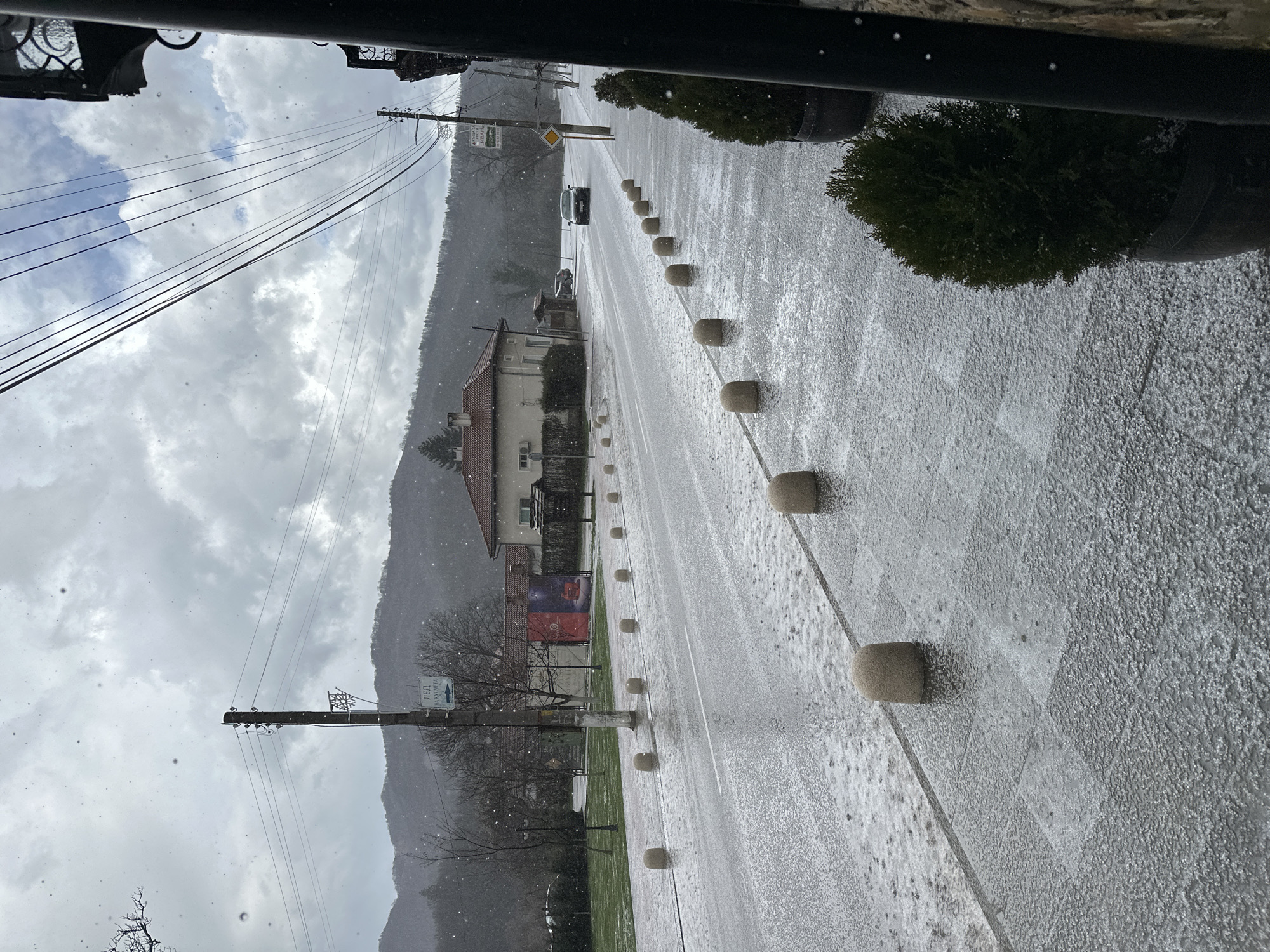 The image depicts a street scene in Oreshak, Bulgaria, during light snowfall under an overcast sky. The foreground features a wet, textured tiled sidewalk on the right, bordered by dark planters containing small green coniferous shrubs. A dark architectural element with ornate black metal railings is partially visible on the far right, suggesting the vantage point. A line of approximately eleven light-colored, dome-topped stone bollards separates the sidewalk from the asphalt road, which is also wet and exhibits patches of melting snow or slush. A single white dashed line marks the center of the visible road segment. Beyond the bollards on the left, a strip of green grass and bare deciduous trees are visible. Further down the road on the left, a light-colored building with a terracotta tiled roof and an external air conditioning unit is present, partially obscured by trees. In the mid-ground, a dark-colored sedan or SUV is seen driving away on the right side of the road. Further down, another dark-colored car is parked on the left. Multiple wooden utility poles with numerous overhead power lines extend down both sides of the street. On a utility pole on the left, a white sign with a blue arrow pointing left and Cyrillic text "ЛЕД НА КУХНЯТА" (LED NA KUHNYATA), accompanied by a snowflake emblem, is attached. A promotional poster with red and gold elements is visible further down on the left. A yellow diamond-shaped road sign (priority road) stands on the right side of the road in the distance. The background consists of snow-dusted mountains or hills covered with sparse vegetation. Small white specks are visible throughout the image, indicating ongoing light snowfall. No individuals are present.