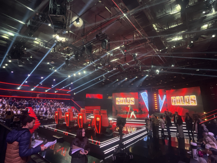 A vibrant television set showcases "GALOS" in bold letters on large screens, illuminated by spotlights. An audience fills tiered seating, facing the stage with prominent red chairs. On the stage, a performer is visible, surrounded by production staff and equipment. A woman and a man hold papers in the foreground. Overhead, complex rigging supports numerous lights and cameras.