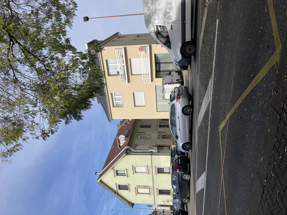 This image depicts a street scene in Bischheim, France, under a clear blue sky with some tree foliage visible at the top. The scene features two prominent multi-story buildings. On the left, a light green stucco building with a brown tiled gable roof and a visible chimney stands. It has several rectangular windows, some with external roller shutters. A satellite dish is affixed to the roof, and an outdoor air conditioning unit is visible on its side. To the right, a newer, three-story light beige stucco building with a dark grey flat roof is present. This building features two white-railed balconies; the upper one contains outdoor furniture, while the lower one has a red "À VENDRE/À LOUER" (For Sale/For Rent) sign. The ground floor of this building appears to be a commercial space, with large windows partially obscured by interior coverings, and a white utility van with ladders on its roof rack is parked in front of it. On the asphalt road in the foreground, several vehicles are stopped. From left to right, a dark grey or black hatchback (Peugeot 308) is partially visible. Immediately to its right is a silver station wagon (Peugeot 308 SW). A large white utility van (Mercedes-Benz Sprinter) is positioned on the right side of the road, facing left, partially obscuring the entrance to the beige building. The road surface shows white pedestrian crossing markings and yellow boundary lines. Scattered autumn leaves are visible on the road and on the grey interlocking paver sidewalk to the left. A tall, dark lamppost is visible behind the beige building on the right, and a street light pole is on the far left. No individuals are visible in the immediate foreground.