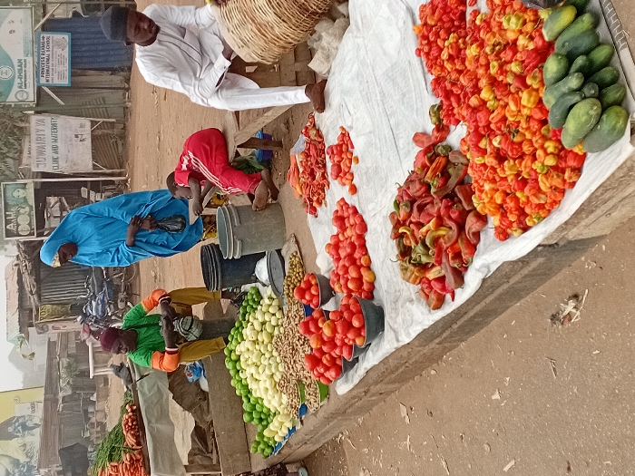 - "An outdoor market stall in Dorayi, Nigeria, displays a variety of produce on a raised concrete platform and white tarps" by FM-TAum93, licensed under CC BY 4.0
