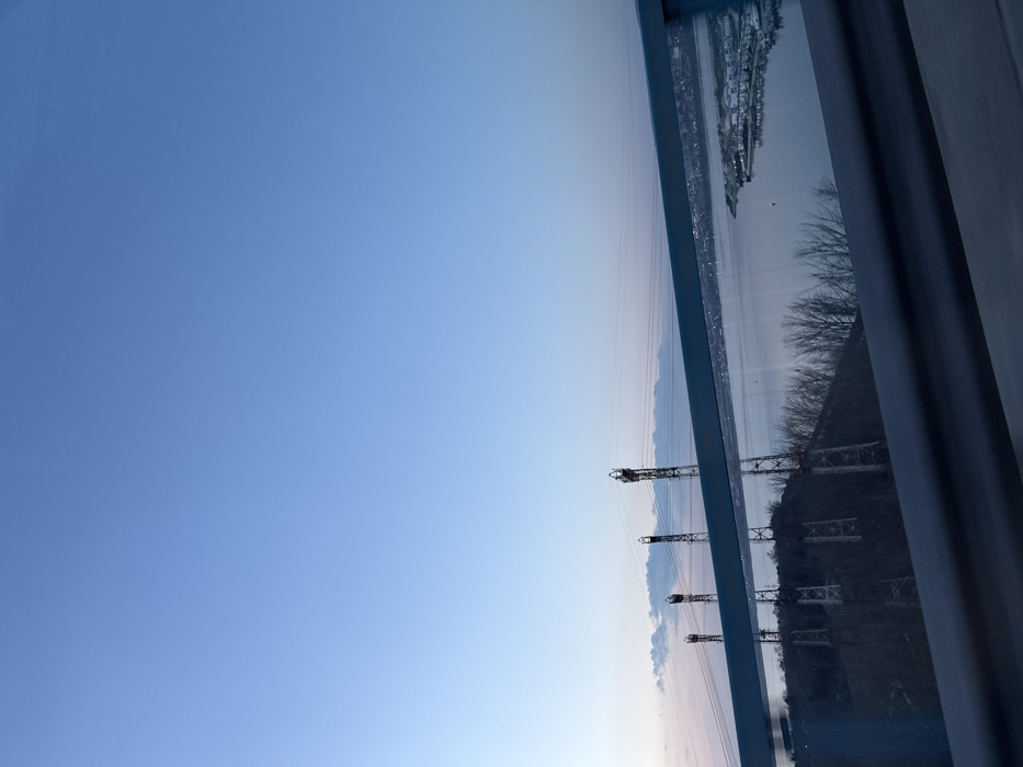 The image depicts an elevated view from the Asparuhov Bridge in Varna, Bulgaria, during twilight conditions. In the foreground, a metallic blue-grey bridge barrier is visible, extending horizontally across the lower third of the frame, with a subtle reflection on its lower edge. To the left of the midground, a densely vegetated hillside with numerous bare-branched trees slopes downwards towards a body of water. Four large, lattice-structured electrical transmission towers (pylons), constructed of metal, ascend the hillside from left to right, carrying overhead power lines that traverse the scene. The tops of these pylons are equipped with insulators and conductor attachments. The central and right portions of the midground are dominated by the calm, reflective surface of Varna Lake. Faint reflections of the transmission towers are visible on the water. On the distant bank of the lake to the right, a developed shoreline is apparent, featuring numerous light-colored buildings and structures, suggestive of a port, marina, or residential area, with faint artificial lights discernible. The sky occupies the upper two-thirds of the image, displaying a clear gradient from a pale, light blue near the horizon to a deeper blue overhead. A thin, horizontal band of wispy clouds is visible low on the horizon above the hillside on the left. No individuals or active subjects are present in the scene.