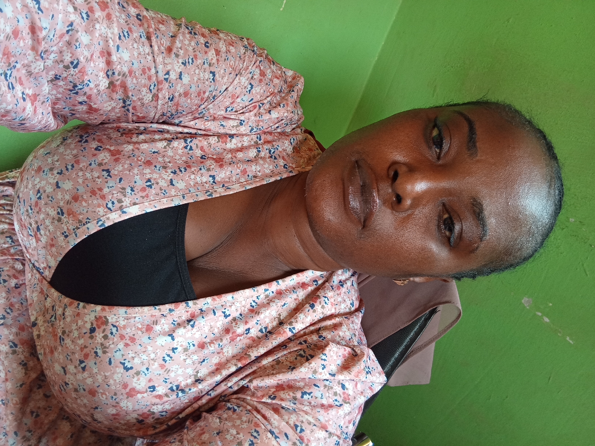 A woman sits indoors against a green wall. She has dark skin, dark hair pulled back, and is wearing a floral top over a black garment. She is wearing an earring in her left ear. The setting is indistinct and shows no features recognizable as Muhammadu Dikko Stadium or Nigeria.