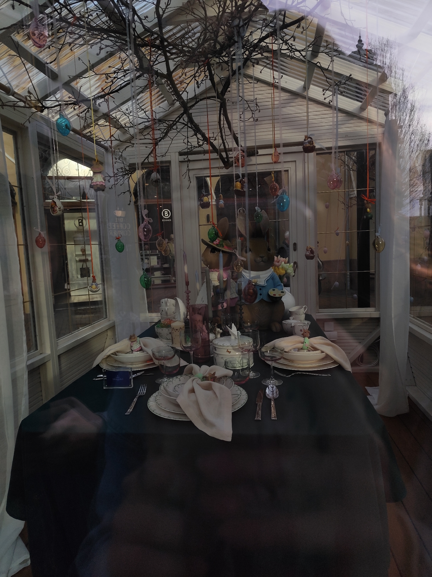 This image captures a static indoor display, likely a shop window or conservatory, located in Wertheim, Germany. The primary subject is a rectangular table draped with a dark tablecloth, set for multiple individuals. Each place setting consists of cream-colored plates and bowls, silverware, and a folded cream napkin, some secured by small decorative rabbit figures. A "Villeroy & Boch" brand tag is visible on the table. The table's centerpiece features several large rabbit figurines, including one wearing a blue jacket and holding an artist's palette, alongside artificial flowers, stacked cups, serving dishes, and two candlesticks with candles. Above the table, a bare tree branch is arranged to span the display area. Numerous multicolored decorative eggs, some patterned, are suspended from this branch and the glass ceiling structure by ribbons of varying lengths. The immediate environment is a glass-paned structure, resembling a conservatory or sunroom, with visible white framing for the roof and walls. The floor is wooden. Reflections on the glass exterior are prominent, showing inverted text such as "COFFEE" and a "B BOONER" retail sign with a circular 'B' logo, alongside reflections of bare trees and distant architecture. The overall presentation suggests a seasonal, possibly Easter-themed, domestic or retail display.