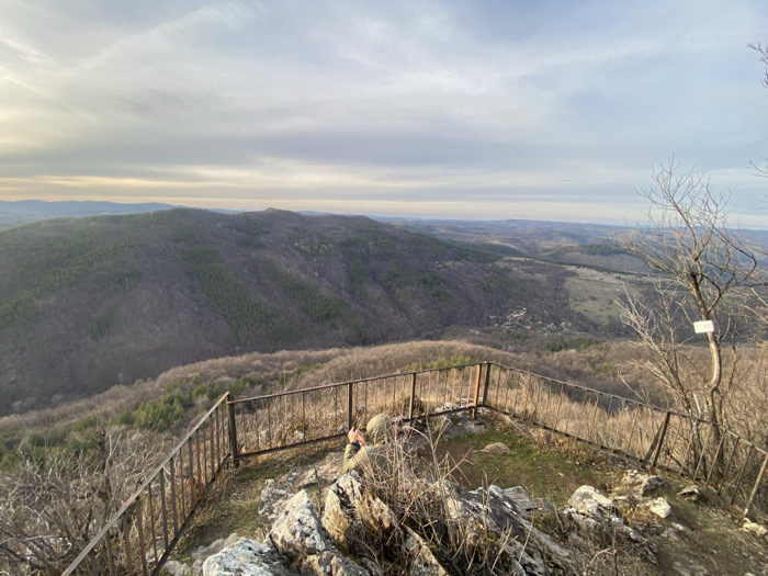 The image presents a panoramic view from an elevated mountain observation point in Brezhnitsite, Bulgaria. In the immediate foreground, rocky terrain with sparse dry grass and brush is visible, bordered by a weathered, dark metal safety railing that forms an enclosure. Inside this enclosure, to the right of the center, a single individual is crouched or kneeling, seen primarily from the back, wearing olive-green or camouflage-patterned clothing. Their head is obscured. To the far right, a bare-branched tree stands with a small, light-colored rectangular sign attached to its trunk. Beyond the railing, the landscape descends into a valley flanked by multiple forested mountain ranges. The trees covering these slopes are predominantly deciduous and appear bare, with some patches of evergreen foliage. A small cluster of buildings, indicative of a village or settlement, is visible within the valley towards the center-right. The sky overhead is partly cloudy, displaying a pale blue hue with horizontal cloud formations and a hazy horizon line in the distance.