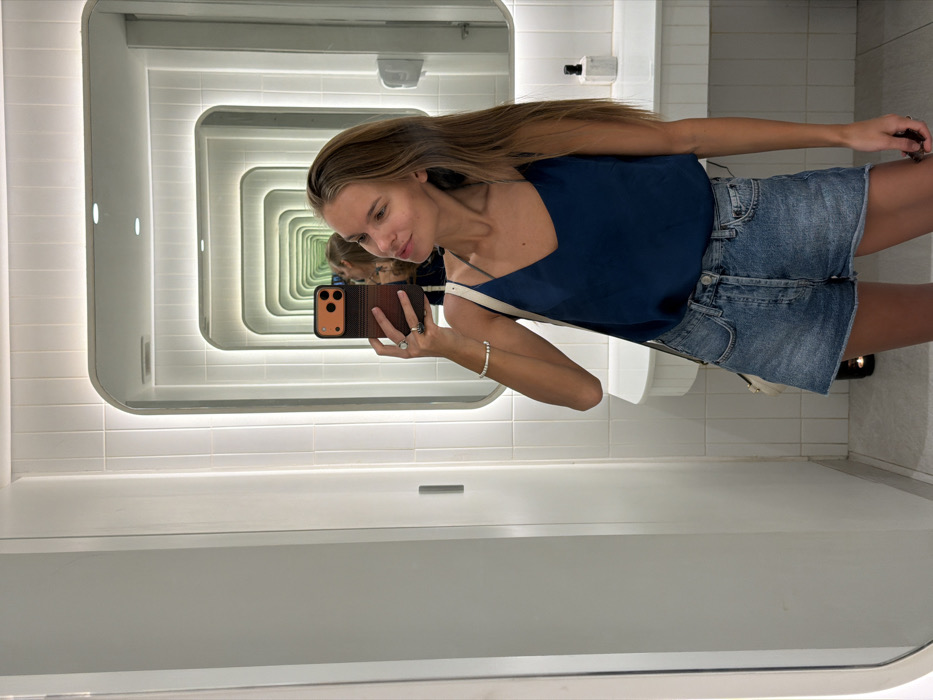 A fair-skinned woman is captured taking a selfie in a brightly lit bathroom with a unique infinity mirror. She is dressed in a dark blue tank top, denim shorts, and a crossbody bag. The mirror creates a tunnel-like illusion with repeating reflections of the woman holding her phone. The bathroom is decorated with white tiles and features minimalist fixtures, including a soap dispenser and a toilet partially visible in the background.