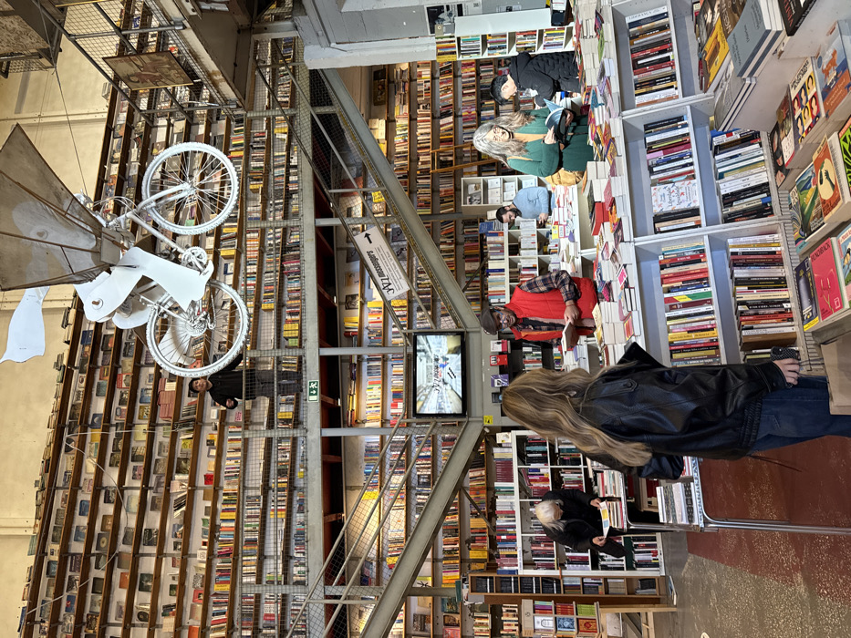 This image depicts the interior of the Ler Devagar bookstore, located within the LX Factory in Alcântara, Lisbon, Portugal