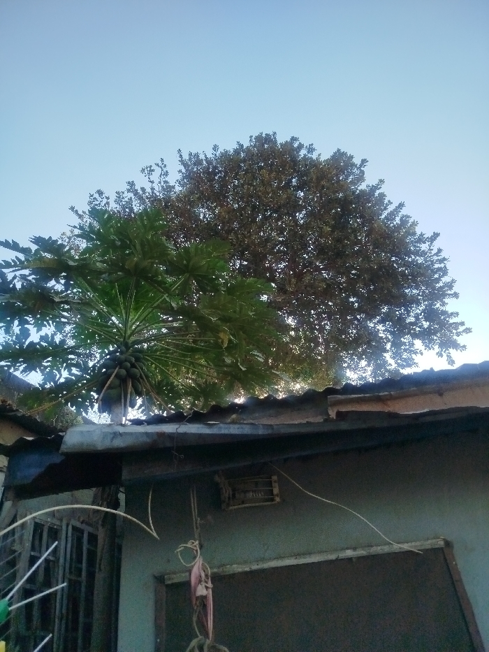 A low-angle shot reveals a humble abode with a corrugated metal roof, partially obscuring a gray wall with a framed, dark panel. Wires and a rope hang near a small, rectangular vent. A papaya tree laden with unripe fruit grows incongruously from the roof, its vibrant green leaves contrasting with the surrounding brown foliage of a larger tree behind it. Above, a clear blue sky stretches to the horizon.