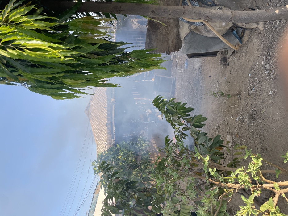A low-angle shot depicts a hazy scene in what appears to be a rural setting. A building with a pitched roof is obscured by smoke. Foliage is prominent, including leafy trees in the foreground and a cascading green plant at the top of the frame. The ground is dirt and littered with debris. An uneven sky is pale blue. A building to the right has debris and what looks like a large stone on it.
