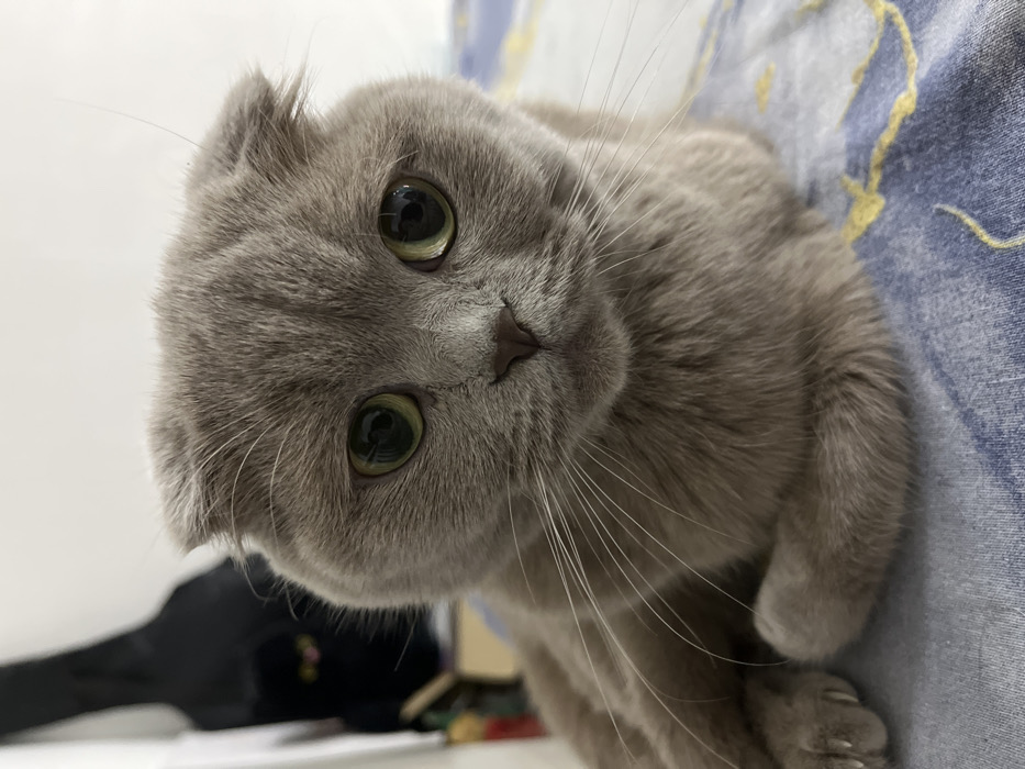 A gray Scottish Fold cat with large, round, green eyes stares directly at the camera. The cat's head is tilted to the left. It has a short, rounded face, and its ears are folded forward. The cat's fur is soft and fluffy. The background is blurred, but it appears to be a bed with blue patterned sheets. A dark object is visible in the lower left corner. The overall image is soft and warm.