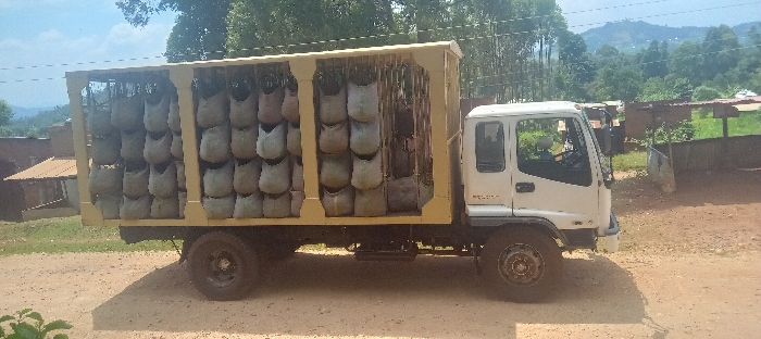 A truck is parked on a dirt road. The flatbed of the truck is enclosed with a tan frame filled with rows and columns of gray sacks, likely containing plants, hanging inside. The cab of the truck is white. The background shows a mix of green foliage, mountains, and small, simple structures. The overall impression is of a rural setting where goods, likely plants, are being transported.