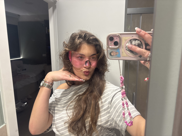 An individual is depicted taking a mirror selfie. The subject is a female with long, wavy brown hair, wearing a grey and white striped off-the-shoulder top. She wears large, frameless, pink-tinted protective eyewear/sunglasses. Her left hand is positioned near her chin, forming a gesture with fingers curled, displaying rings and a French manicure. A silver-toned watch and multiple bracelets are present on her left wrist. Her lips are puckered. She holds a light pink iPhone, likely a Pro Max model, in her right hand, capturing the image. The phone case is light pink and adorned with stickers, including a small portrait of a male and a circular black and white image. A pink beaded phone charm is attached to the device. The background, reflected in the mirror, shows an interior room, possibly a bedroom, featuring a bed with white bedding and a doorframe. The scene is located in Getafe, Spain.