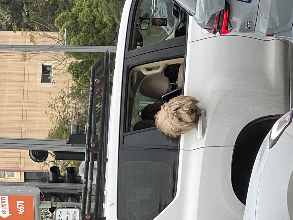 The image captures a daytime street scene in Tel-Aviv, Israel, at or near the intersection of Bondansky Street and Ha-Ne'eman Street, as indicated by a prominent street sign displaying "בונדזקי 68" and "NANON ST" (Ha-Ne'eman St.). The central subject is a shaggy, light-brown dog with matted fur, whose head is extended from the partially open rear passenger window of a white SUV. The dog's chin rests on the upper edge of the door frame, positioned above the exterior door handle, and it appears to be looking downward. The SUV, possibly a Toyota Land Cruiser Prado, features a black roof rack with multiple crossbars. The interior reveals light-colored seats and a partial view of a person in the front passenger seat. The white SUV is stationary, positioned in traffic. To its immediate right, the rear section of a dark gray SUV, identified as a BMW X5 by visible badging and displaying a blue and white Israeli license plate, is visible with its red taillight illuminated. In the foreground, the front left portion of another white vehicle is present. In the background, a large, weathered, beige-colored building with a single visible rectangular window stands behind a line of green trees and bushes. A metal traffic light pole is situated on the left, displaying two illuminated red traffic signals. The sky is overcast.