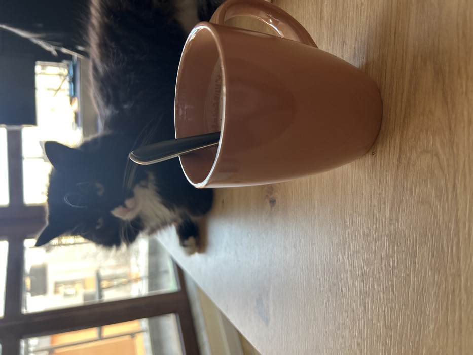 - "This image depicts an interior scene in Sofia, Bulgaria, featuring a domestic long-haired cat and a ceramic mug on a wooden table" by FM-3KgxS2, licensed under CC BY 4.0