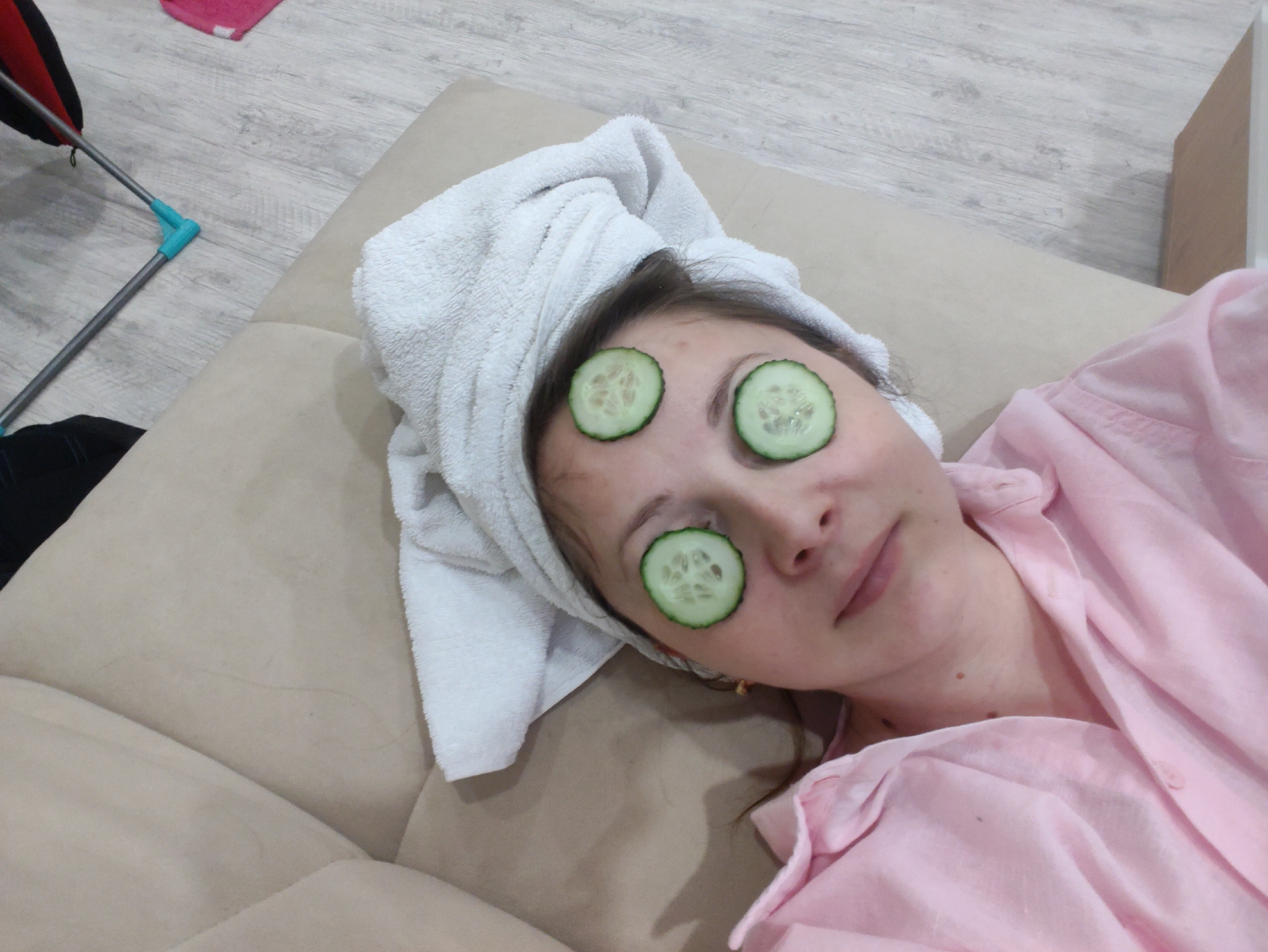 - "A young woman is lying down on a beige couch with a white towel wrapped around her head" by FM-z04TH2, licensed under CC BY 4.0