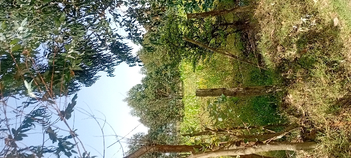 A landscape exhibits a row of trees along a narrow clearing filled with green vegetation. Sunlight illuminates the clearing, contrasting with the shade beneath the trees. The foreground includes branches with leaves, slightly obscuring the view. The sky is visible through the foliage. The overall scene suggests a natural setting, possibly a forest edge or grove.