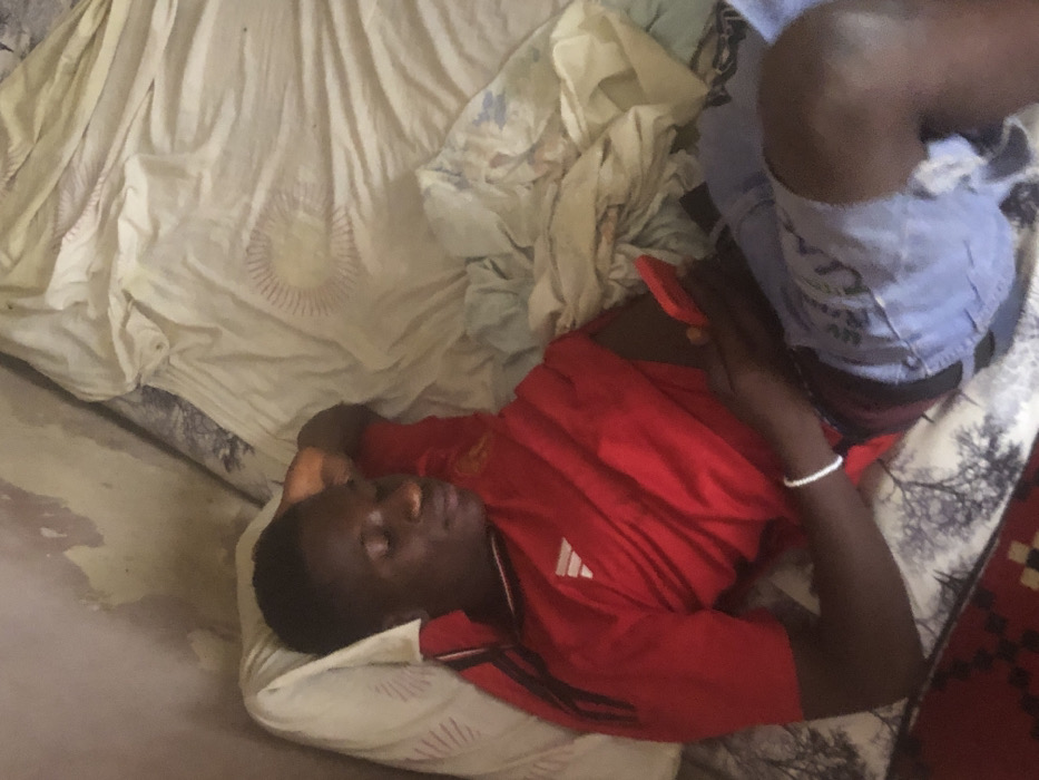 An indoor scene in Dutsinma B, Nigeria, depicts a young Black male lying supine on a bed
