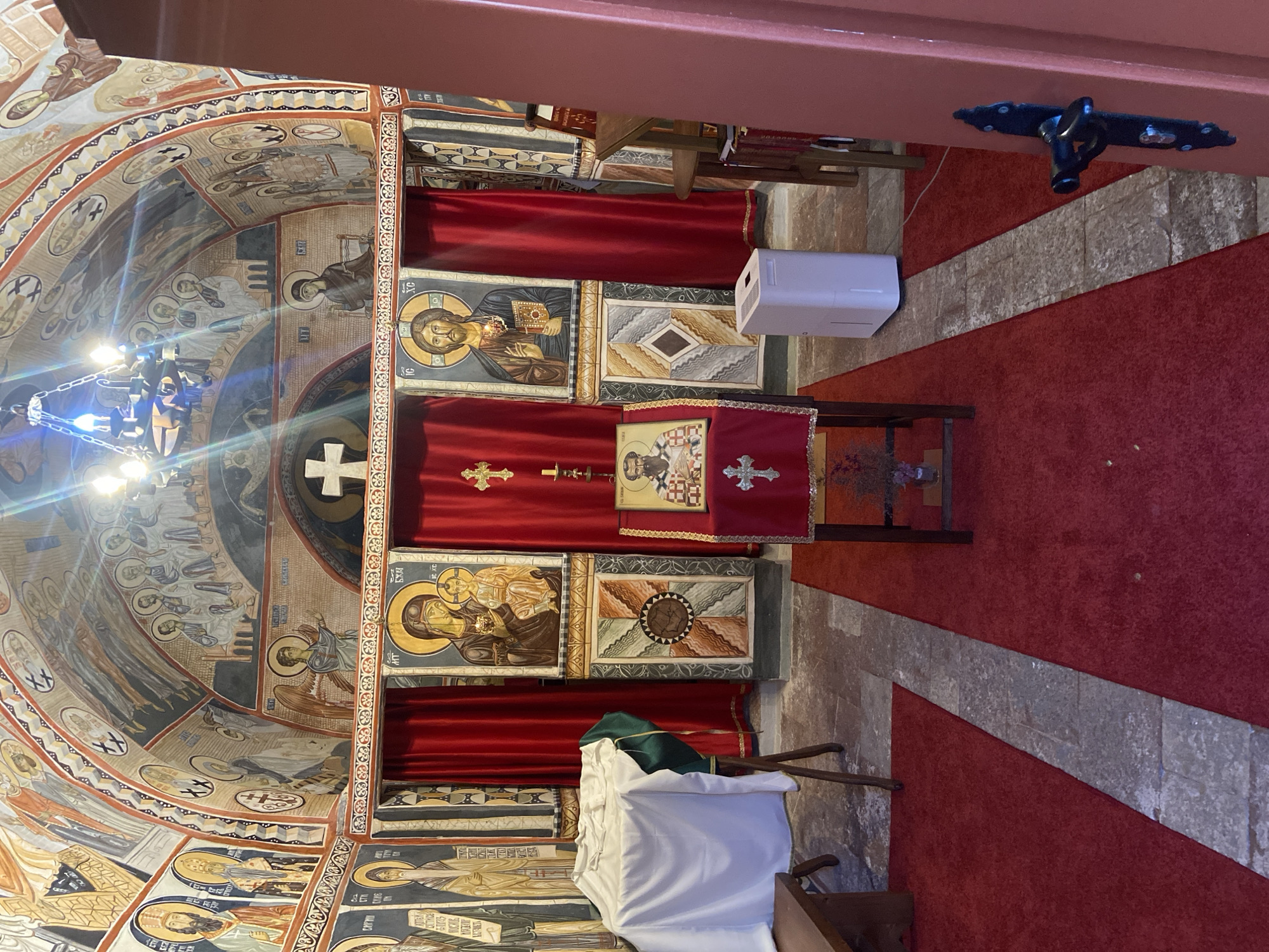The image displays the interior of an Orthodox Christian church located in Donji Katun, Montenegro. The perspective is from near the entrance, looking towards the altar area. The entire walls and vaulted ceiling are covered with multi-colored frescoes depicting numerous saints, biblical figures, and religious scenes in a Byzantine iconographic style. A prominent white cross is painted on the wall above the iconostasis at the center-back. A dark metal chandelier with exposed light bulbs hangs from the vaulted ceiling, providing illumination. The floor is predominantly covered by a deep red carpet, with a central pathway of grey stone tiles leading from the foreground towards the altar. At the back, an iconostasis features two primary icons: the Virgin Mary holding the infant Jesus on the left, and Jesus Christ Pantocrator on the right, both adorned with haloes. These icons are set against red curtains with golden trim, which likely conceal openings to the altar. Below the main icons are decorative panels with geometric and sunburst patterns in various earthy tones. A small golden wall-mounted cross with candleholders is visible to the right of the Virgin Mary icon. In the mid-ground, a wooden stand draped with a red cloth, adorned with a white cross, displays a framed icon of a bearded male saint. Below this icon, a small glass vase containing dried purple flowers is visible on a lower shelf of the stand. To the right of this stand, a white, rectangular modern dehumidifier unit is positioned on the red carpet. On the left side of the nave, a dark wooden bench is visible against the wall. Adjacent to it stands a wooden tripod-like frame draped with a green cloth, over which a white cloth is laid, covering an unseen object. Part of a reddish-brown wooden door frame and a black metal door handle mechanism are visible on the far right foreground. No individuals are present in the scene.