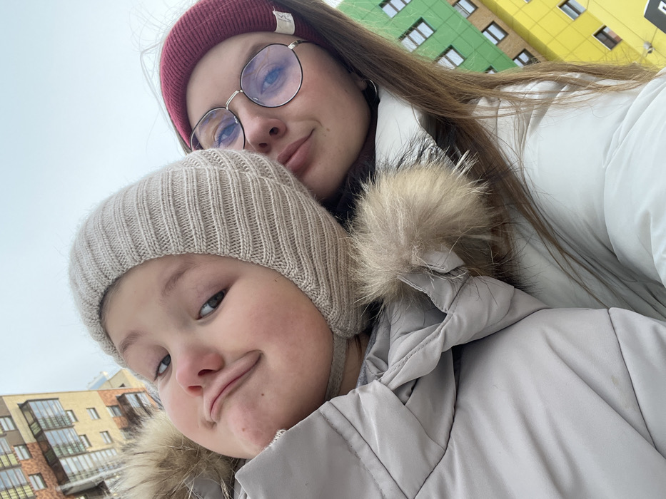 A selfie of two people in winter clothing against a backdrop of buildings and a cloudy sky. The older person wears a maroon beanie and round glasses, with a white puffer jacket. The younger person wears a beige knit cap and a gray coat with a fur-trimmed hood. The younger person has pursed lips, creating a playful expression. The camera is positioned at a high angle, capturing their faces closely.