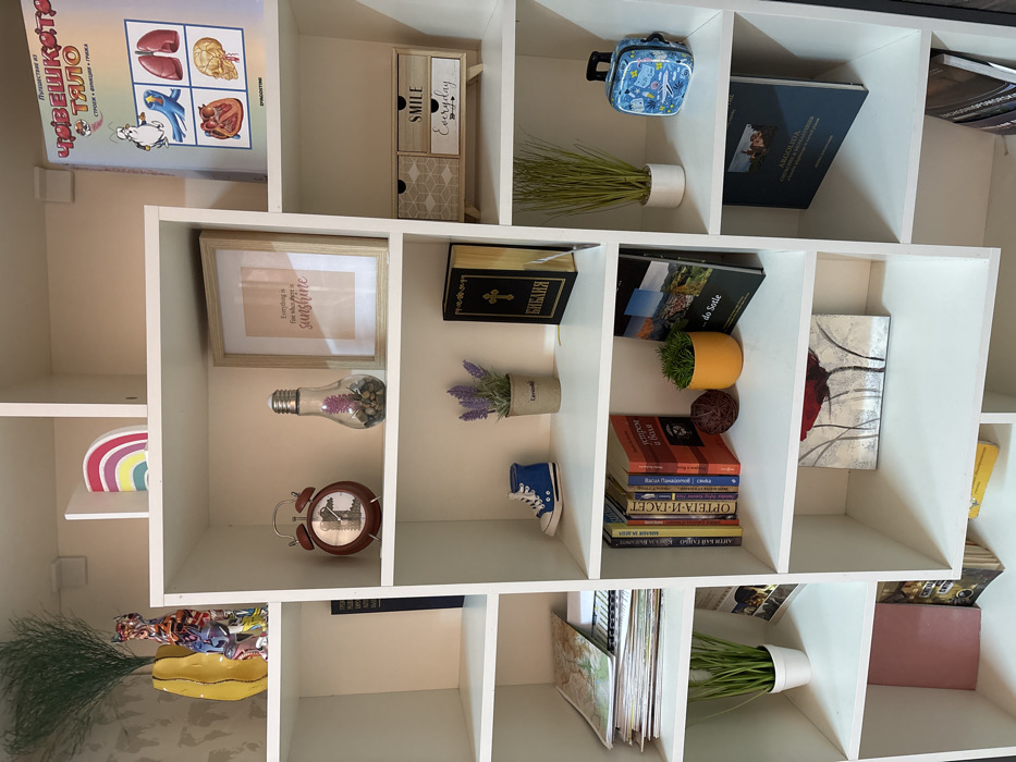 This image depicts a white modular bookshelf system, likely situated in a residence within Nova Zagora, Bulgaria