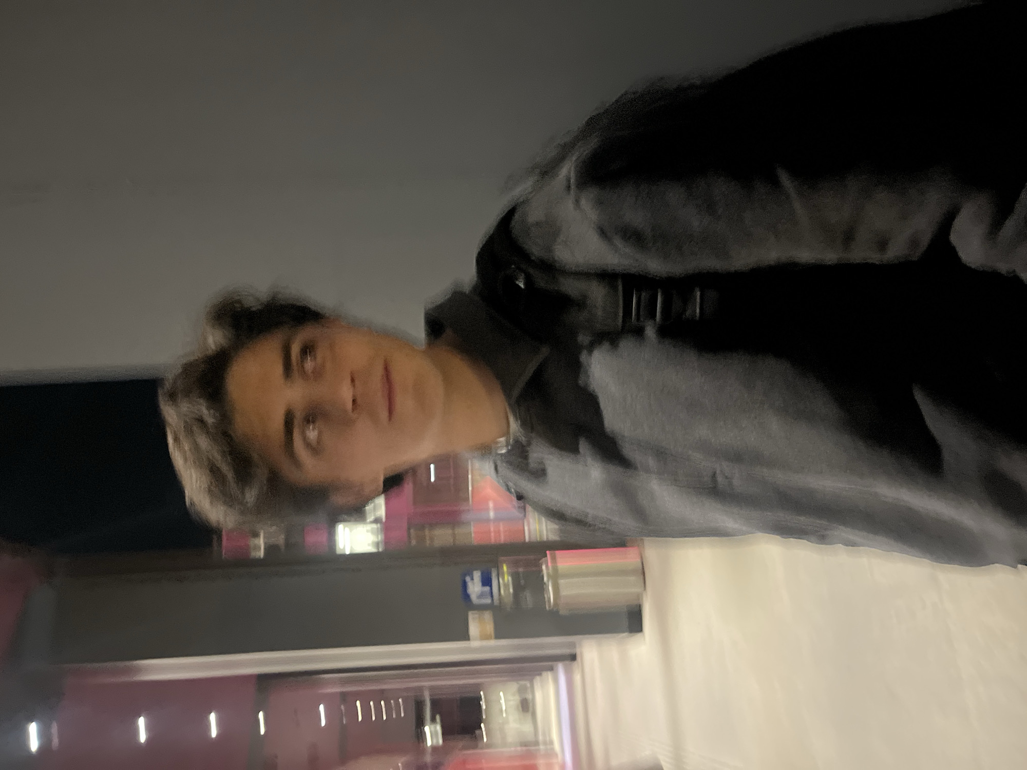 A young male subject, appearing to be in his late teens or early twenties, is depicted from the chest up, positioned slightly to the right of the frame's center. He has medium-dark, slightly wavy hair and is looking towards the viewer's left with a neutral expression. He wears a dark grey, collared long-sleeved shirt with a two-button placket and a black backpack strap over his right shoulder. The background on the left reveals a brightly lit interior corridor, characterized by a light-toned floor and reflective glass-paneled walls. Vertical white strip lights are visible along the left wall. Further along the corridor, pink-hued architectural details are discernible. In the mid-ground, left of the subject, a silver cylindrical waste receptacle is present, topped by a blue and white sign on an adjacent dark pillar. The background to the subject's right consists of a plain, dark grey wall. Artificial lighting illuminates the scene, which exhibits motion blur, indicating movement or a prolonged exposure time. This setting is consistent with a modern indoor commercial complex, specifically resembling areas within a shopping mall such as Paseo Interlomas in Huixquilucan de Degollado, Mexico.