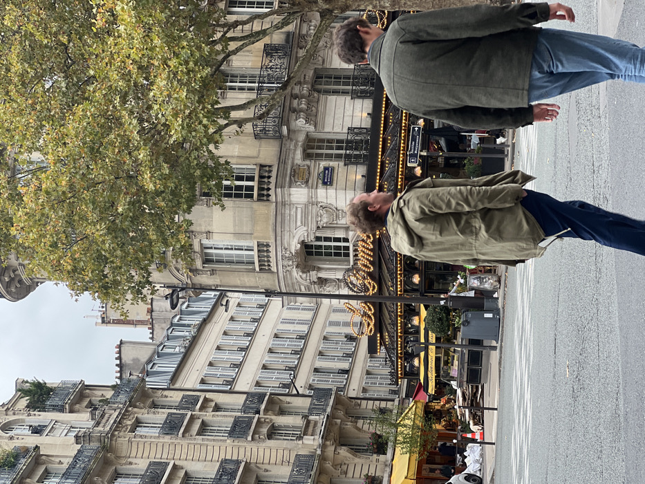 The image captures an urban street scene in Paris, France, specifically at the intersection of Boulevard du Montparnasse and Boulevard Edgar Quinet in the Montparnasse district, identifiable by street signs on the corner building. The sky is overcast. In the foreground, two men walk away from the viewer on a paved street. The man on the left wears an olive green hooded jacket and dark blue pants, with his right profile visible. The man on the right wears a dark green jacket and light blue jeans, his back mostly facing the camera. The midground features the prominent "Le Dôme" brasserie, situated on the corner building. Its name is displayed in illuminated golden letters above a dark awning, under which outdoor seating and tables are visible. A large deciduous tree with green and yellowing leaves partially frames the brasserie on the right. To the left of the men, a street area shows a white vehicle, an orange traffic cone, and several white bags on the ground. The background consists of multi-story Haussmannian-style buildings with light-colored stone facades, ornate wrought-iron balconies, and numerous windows, many fitted with light-colored shutters. Mansard roofs and chimneys are visible against the gray sky. A street sign clearly indicating "BOULEVARD EDGAR QUINET" is affixed to the corner building housing "Le Dôme."