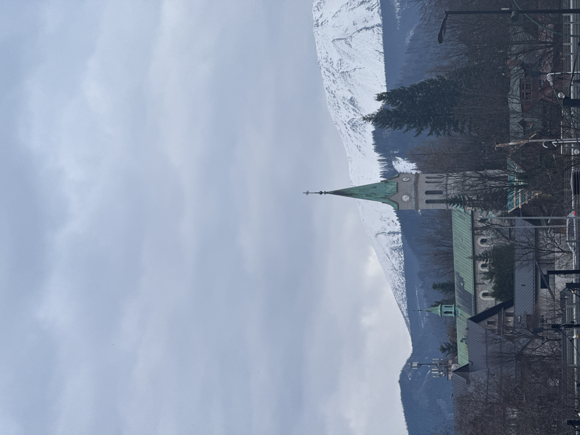 The image displays an urban and mountainous landscape in Zakopane, Poland, under an overcast sky. **Environment:** The upper third of the frame is occupied by a uniform, light grey, overcast sky. The background features a prominent snow-capped mountain range, likely the Tatra Mountains, with substantial snow cover on its upper slopes and dark green coniferous forests at lower elevations. To the left, a separate, darker forested mountain is visible. **Subjects/Objects:** * **Church:** In the mid-ground, a large stone church with a distinct architectural style is central. It features a tall, slender steeple topped with a cross. The steeple has a prominent clock face visible on its left side and is capped with a verdigris-colored spire. The main roof sections of the church also exhibit this verdigris color. The church structure is light grey stone. This building is identifiable as the Church of Our Lady of Czestochowa. * **Buildings:** Surrounding the church are multiple other buildings, primarily with dark grey or black gable roofs, consistent with local architectural styles. Some show dormer windows. One building to the left of the main church appears to be part of a larger complex, featuring a smaller, green-roofed spire. * **Vegetation:** A mix of bare deciduous trees and dark green coniferous trees (pines or spruces) are distributed throughout the scene, both within the city layout and on the mountain slopes. * **Infrastructure:** A multi-tiered cellular or communication tower is visible on a forested hill to the far left. In the foreground, blurred elements of urban infrastructure, including dark poles, overhead wires, and possibly parts of streetlights or vehicles, are discernible, indicating an elevated viewing perspective. **People/Actions/Interactions:** No people are visible within the frame. No actions or interactions are depicted. **Lighting:** The scene is illuminated by diffused, flat natural light, consistent with an overcast sky. There are no harsh shadows.