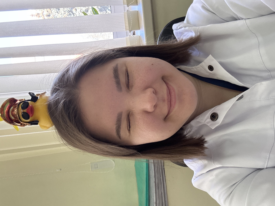 A young female subject with short, dark brown hair and visible freckles is depicted in a close-up, portrait-oriented shot, smiling with her eyes closed. She wears a white medical-style jacket featuring dark snap buttons, layered over a dark blue garment. A yellow rubber duck toy, outfitted with a metallic bronze Roman-style helmet and dark sunglasses, is balanced on her head. The background to the subject's left is a light green wall, displaying a white wall-mounted unit with a hanging white cord, and a stack of papers with a green top sheet. To the subject's right, a window with white vertical blinds is visible, revealing a tree with bare branches and some evergreen foliage against a bright sky. A light-colored windowsill with several small white containers is positioned beneath the window. The overall lighting suggests an indoor daytime setting. The image lacks specific visual identifiers to ascertain the precise location within Kazan, Russia.