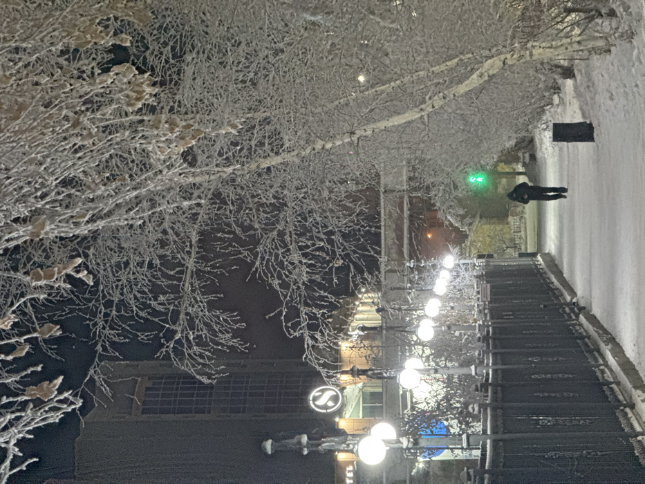 The image depicts a winter night scene in Yakutsk, Russia, specifically along a pathway adjacent to the Azimut Hotel Polar Star, identified by its distinctive "S" logo visible on the building to the left. A single individual is observed walking away from the viewer on a snow-covered paved pathway, wearing dark, heavy winter clothing and a hood. To the left, a line of ornamental streetlights with spherical white globes illuminates the path, paralleled by a dark metal fence. The background on the left features the multi-story hotel building. To the right, a dense row of trees, primarily birch, are heavily encrusted with white rime ice, with a few withered brown leaves clinging to branches. A dark cylindrical waste bin is positioned near the trees. In the mid-distance, a dark bridge structure or overpass is visible, and a green traffic light glows in the far background. The ground is uniformly covered in a layer of snow.